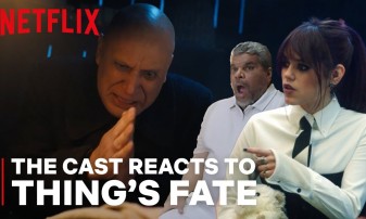 Wednesday cast members Jenna Ortega, Hunter Doohan, Luis Guzman. Fred Armisen, Emma Myers, Percy Hynes White and Naomi Ogawa react to the emotionally-charged scene where Thing's fate hangs in the balance.