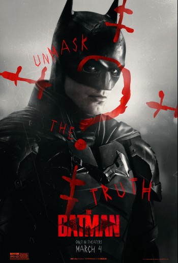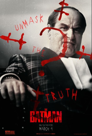 The social campaign for The Batman has published a four new character character posters. First we have Robert Pattinson as our lead character, in full costume. Then we have Zoe Kravitz in Catwoman garb. The third features Paul Dano as the Riddler in his full gimp mask. Finally, there's an image of Colin Farrell as Penguin. All bear the scrawled caption, "Unmask the Truth," while the non-Riddler images have the question mark painted over the image. The film arrives in theaters March 4.