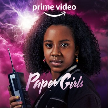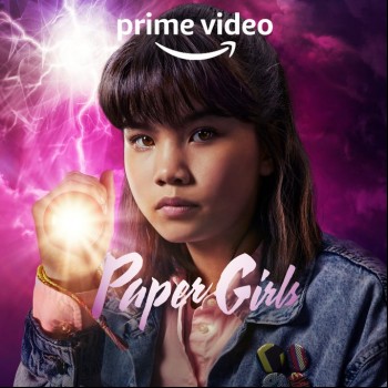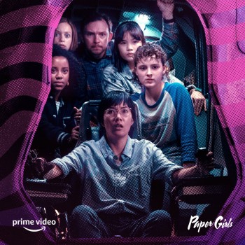 The social campaign for Prime Video's Paper Girls has released a new piece of key art for the series. This one features the titular paper girls played by Sofia Rosinsky, Riley Lai Nelet, Camryn Jones and Fina Strazza along with adult cast members Nate Corddry and Ali Wong. The six are huddled inside some kind of pod, which might be one of the time travel elements from the story. The first episodes drop Friday on Prime.