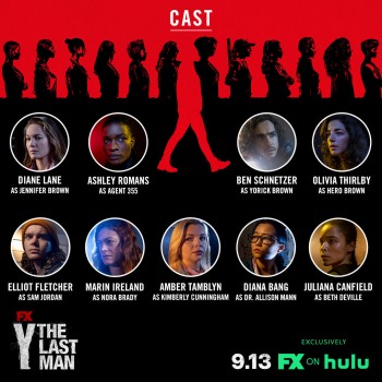 The social campaign for Y: The Last Man has begun releasing new character posters for the show. While the previous set featured actors obscured by shadow with no identifying copy or context, this new set seeks to full illuminate who is who among the supporting cast of the show. Released so far are images of Juliana Canfield as Beth Deville, Diana Bang as Dr. Allison Mann, Amber Tamblyn as Kimberly Cunningham, Marin Ireland as Nora Brady, Elliot Fletcher as Sam Jordan and Olivia Thirlby as Hero Brown. They've also provided a full cast poster with all of the previously mentioned cast, as well as Diane Lane as Jennifer Brown, Ashley Romans as Agent 355 and Ben Schnetzer as Yorick Brown, the titular last living man on Earth. The new show premieres September 13 on FX on Hulu.